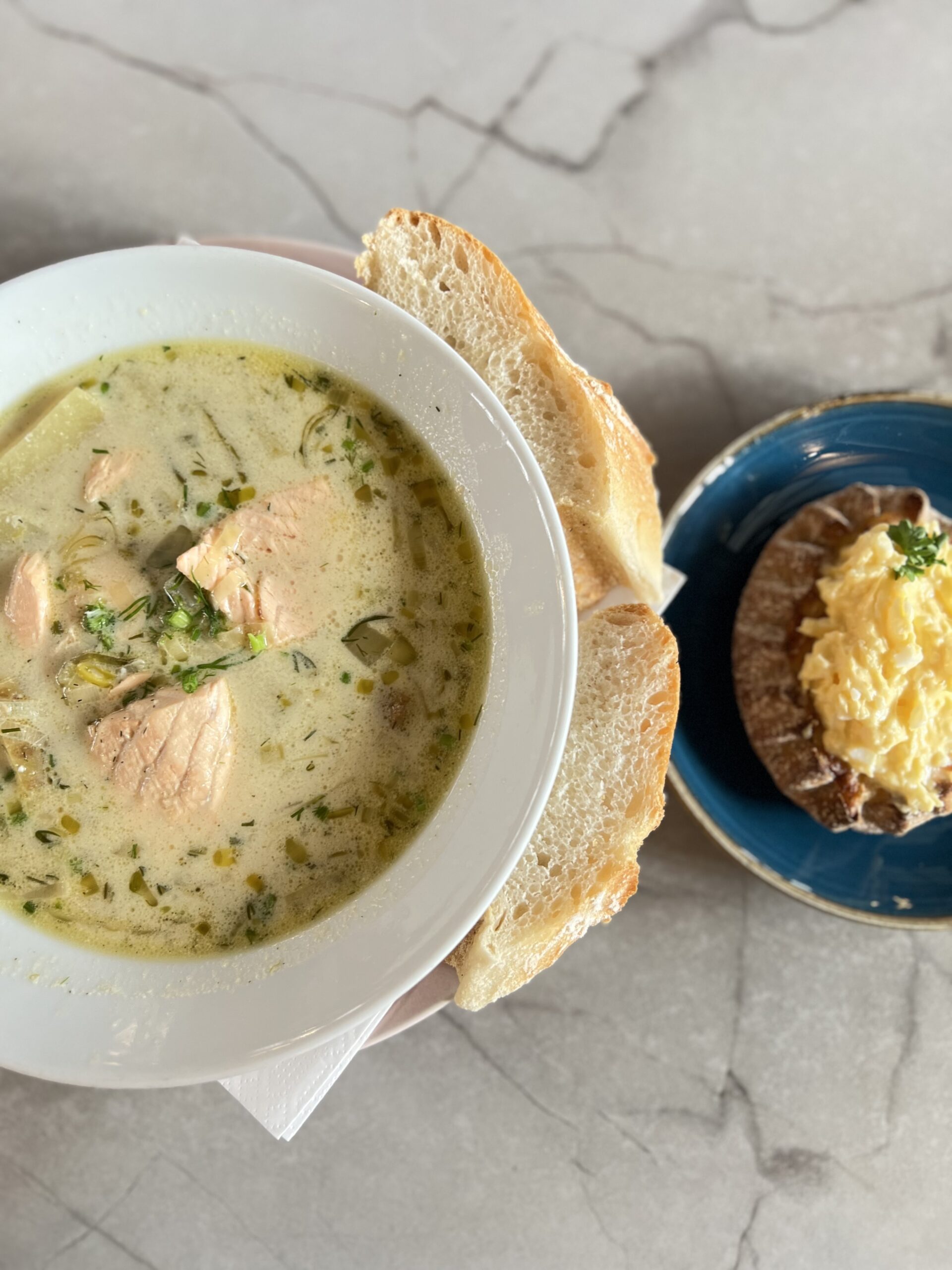 名物のサーモンスープとカレリアパイで
